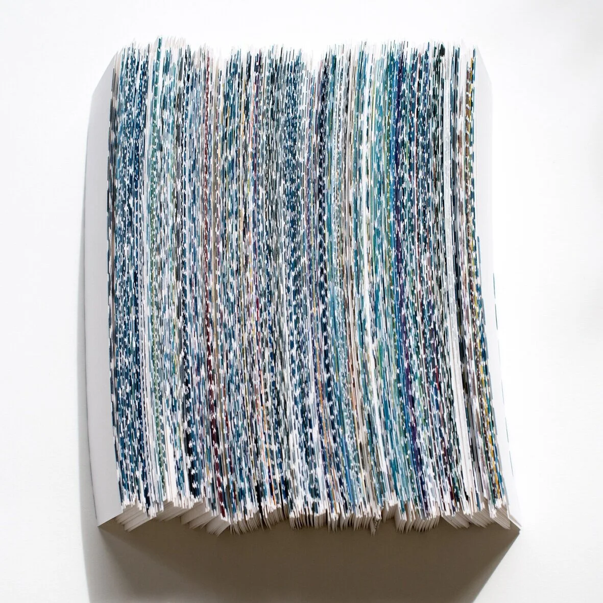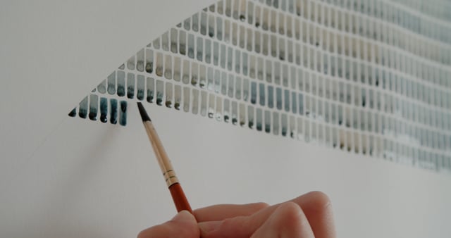 My inherent nature is careful and considered, so the works I make have a controlled organisation to them, however I am equally fascinated by the aspects of the processes that are completely spontaneous and unplanned - for instance the reverse side of embroidered work, the collected strips of paper used to mask the edges of my paintings, or the built up drips of colour left as a residue on the sides of my water pot.